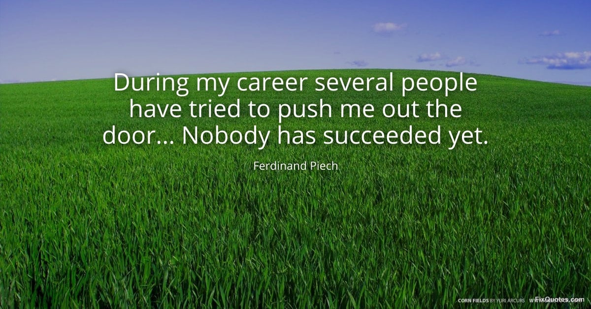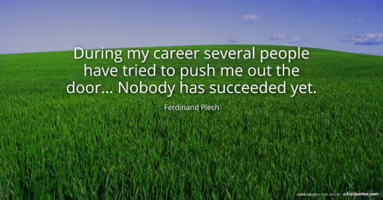 Piech, Ferdinand. "During my career several people have tried to push me out the door... Nobody has succeeded yet." FixQuotes. January 15, 2026. https://fixquotes.com/quotes/during-my-career-several-people-have-tried-to-123115/.