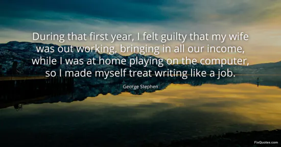 Stephen, George. "During that first year, I felt guilty that my wife was out working, bringing in all our income, while I was at home playing on the computer, so I made myself treat writing like a job." FixQuotes. February 17, 2026. https://fixquotes.com/quotes/during-that-first-year-i-felt-guilty-that-my-wife-105125/.