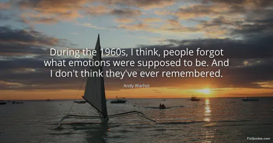 Warhol, Andy. "During the 1960s, I think, people forgot what emotions were supposed to be. And I don't think they've ever remembered." FixQuotes. January 15, 2026. https://fixquotes.com/quotes/during-the-1960s-i-think-people-forgot-what-14258/.