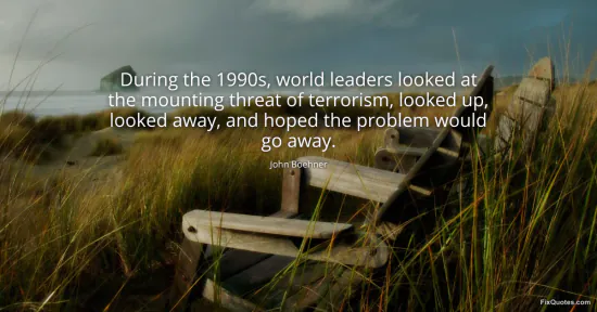 Boehner, John. "During the 1990s, world leaders looked at the mounting threat of terrorism, looked up, looked away, and hoped the problem would go away." FixQuotes. January 17, 2026. https://fixquotes.com/quotes/during-the-1990s-world-leaders-looked-at-the-53905/.