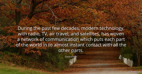 Bohm, David. "During the past few decades, modern technology, with radio, TV, air travel, and satellites, has woven a network of communication which puts each part of the world in to almost instant contact with all the other parts." FixQuotes. January 15, 2026. https://fixquotes.com/quotes/during-the-past-few-decades-modern-technology-143520/.