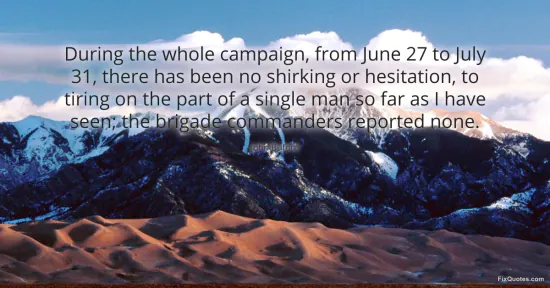 "During the whole campaign, from June 27 to July 31, there has been no shirking or hesitation, to tiring on the part of a single man so far as I have seen; the brigade commanders reported none." FixQuotes, 17 Jan. 2026, https://fixquotes.com/quotes/during-the-whole-campaign-from-june-27-to-july-31-66009/. Accessed 12 Feb. 2026.