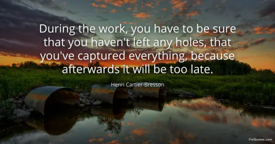 Cartier-Bresson, Henri. "During the work, you have to be sure that you haven't left any holes, that you've captured everything, because afterwards it will be too late." FixQuotes. Accessed February 2, 2026. https://fixquotes.com/quotes/during-the-work-you-have-to-be-sure-that-you-68072/.