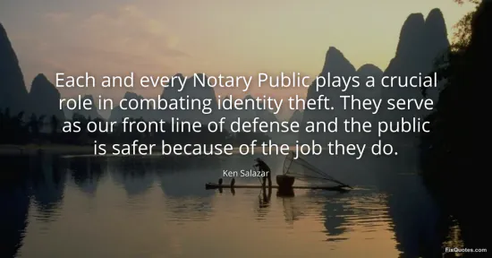 Salazar, Ken. "Each and every Notary Public plays a crucial role in combating identity theft. They serve as our front line of defense and the public is safer because of the job they do." FixQuotes. January 16, 2026. https://fixquotes.com/quotes/each-and-every-notary-public-plays-a-crucial-role-101885/.