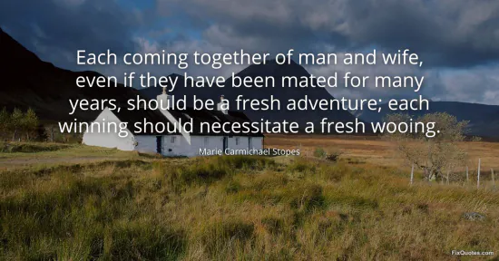 Stopes, Marie Carmichael. "Each coming together of man and wife, even if they have been mated for many years, should be a fresh adventure; each winning should necessitate a fresh wooing." FixQuotes. January 15, 2026. https://fixquotes.com/quotes/each-coming-together-of-man-and-wife-even-if-they-118350/.