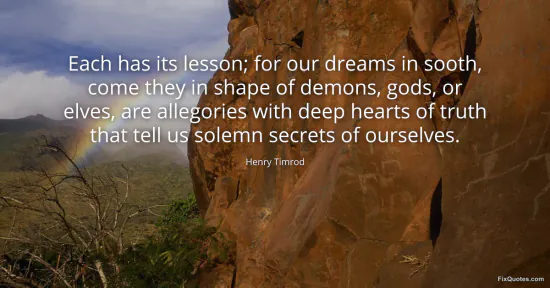 Timrod, Henry. (2026, January 15). Each has its lesson; for our dreams in sooth, come they in shape of demons, gods, or elves, are allegories with deep hearts of truth that tell us solemn secrets of ourselves. FixQuotes. https://fixquotes.com/quotes/each-has-its-lesson-for-our-dreams-in-sooth-come-158420/