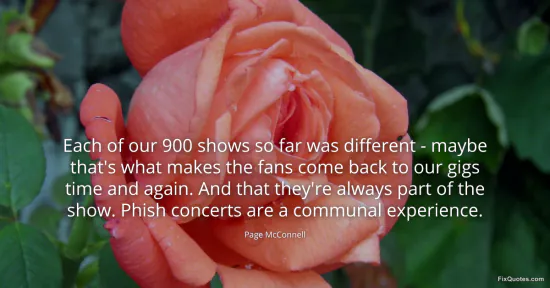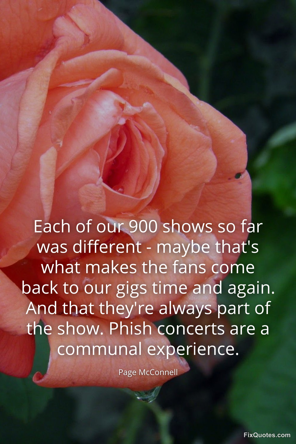 McConnell, Page. (2026, January 15). Each of our 900 shows so far was different - maybe that's what makes the fans come back to our gigs time and again. And that they're always part of the show. Phish concerts are a communal experience. FixQuotes. https://fixquotes.com/quotes/each-of-our-900-shows-so-far-was-different-169631/