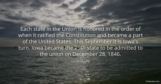 Boswell, Leonard. (2026, January 15). Each state in the Union is honored in the order of when it ratified the Constitution and became a part of the United States. This September it is Iowa's turn. Iowa became the 29th state to be admitted to the union on December 28, 1846. FixQuotes. https://fixquotes.com/quotes/each-state-in-the-union-is-honored-in-the-order-166189/