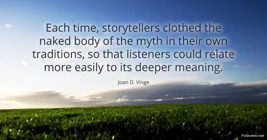 Vinge, Joan D. "Each time, storytellers clothed the naked body of the myth in their own traditions, so that listeners could relate more easily to its deeper meaning." FixQuotes. January 15, 2026. https://fixquotes.com/quotes/each-time-storytellers-clothed-the-naked-body-of-57208/.