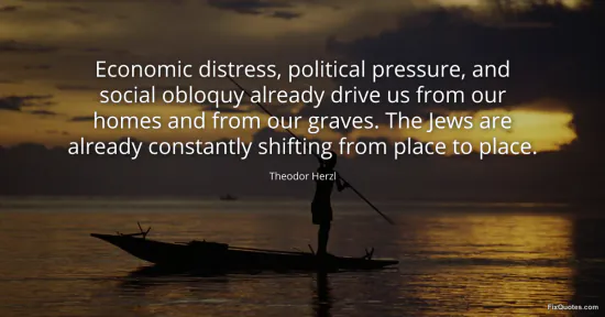 Herzl, Theodor. (2026, January 16). Economic distress, political pressure, and social obloquy already drive us from our homes and from our graves. The Jews are already constantly shifting from place to place. FixQuotes. https://fixquotes.com/quotes/economic-distress-political-pressure-and-social-113667/