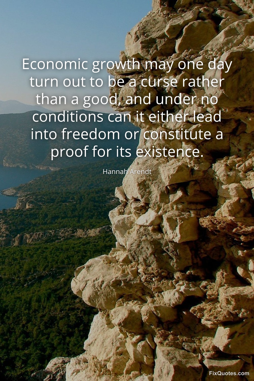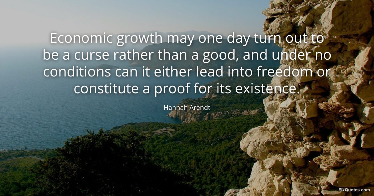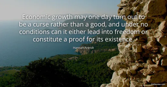 Arendt, Hannah. (2026, January 16). Economic growth may one day turn out to be a curse rather than a good, and under no conditions can it either lead into freedom or constitute a proof for its existence. FixQuotes. https://fixquotes.com/quotes/economic-growth-may-one-day-turn-out-to-be-a-111378/