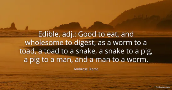 Bierce, Ambrose. "Edible, adj.: Good to eat, and wholesome to digest, as a worm to a toad, a toad to a snake, a snake to a pig, a pig to a man, and a man to a worm." FixQuotes. January 18, 2026. https://fixquotes.com/quotes/edible-adj-good-to-eat-and-wholesome-to-digest-as-3683/.