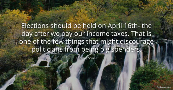 Sowell, Thomas. "Elections should be held on April 16th- the day after we pay our income taxes. That is one of the few things that might discourage politicians from being big spenders." FixQuotes. January 15, 2026. https://fixquotes.com/quotes/elections-should-be-held-on-april-16th-the-day-2117/.