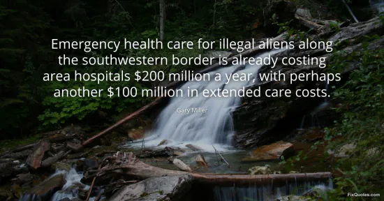 Miller, Gary. "Emergency health care for illegal aliens along the southwestern border is already costing area hospitals $200 million a year, with perhaps another $100 million in extended care costs." FixQuotes. January 15, 2026. https://fixquotes.com/quotes/emergency-health-care-for-illegal-aliens-along-141639/.