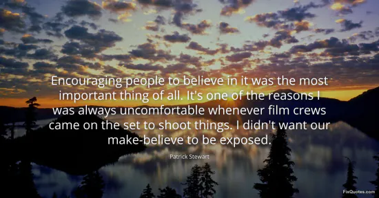 Stewart, Patrick. "Encouraging people to believe in it was the most important thing of all. It's one of the reasons I was always uncomfortable whenever film crews came on the set to shoot things. I didn't want our make-believe to be exposed." FixQuotes. January 15, 2026. https://fixquotes.com/quotes/encouraging-people-to-believe-in-it-was-the-most-159060/.