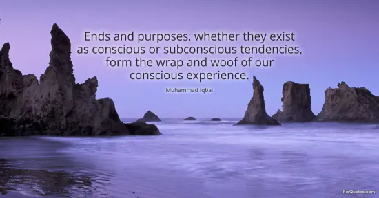 Iqbal, Muhammad. "Ends and purposes, whether they exist as conscious or subconscious tendencies, form the wrap and woof of our conscious experience." FixQuotes. January 16, 2026. https://fixquotes.com/quotes/ends-and-purposes-whether-they-exist-as-conscious-130390/.