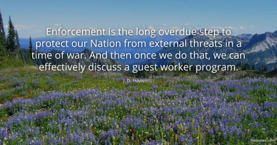 Hayworth, J. D. "Enforcement is the long overdue step to protect our Nation from external threats in a time of war. And then once we do that, we can effectively discuss a guest worker program." FixQuotes. January 16, 2026. https://fixquotes.com/quotes/enforcement-is-the-long-overdue-step-to-protect-108379/.