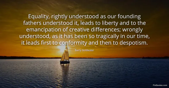 Goldwater, Barry. (2026, January 16). Equality, rightly understood as our founding fathers understood it, leads to liberty and to the emancipation of creative differences; wrongly understood, as it has been so tragically in our time, it leads first to conformity and then to despotism. FixQuotes. https://fixquotes.com/quotes/equality-rightly-understood-as-our-founding-128757/