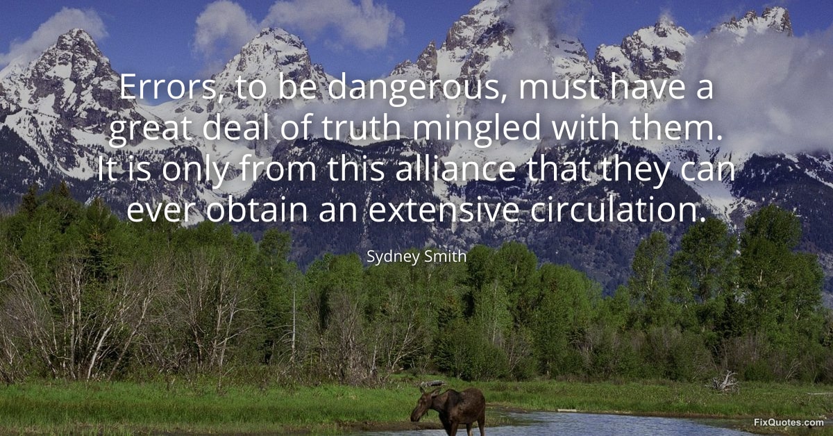 Smith, Sydney. "Errors, to be dangerous, must have a great deal of truth mingled with them. It is only from this alliance that they can ever obtain an extensive circulation." FixQuotes. January 18, 2026. https://fixquotes.com/quotes/errors-to-be-dangerous-must-have-a-great-deal-of-10410/.