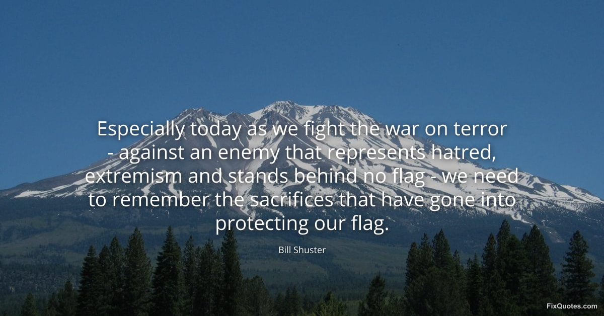 Shuster, Bill. (2026, January 17). Especially today as we fight the war on terror - against an enemy that represents hatred, extremism and stands behind no flag - we need to remember the sacrifices that have gone into protecting our flag. FixQuotes. https://fixquotes.com/quotes/especially-today-as-we-fight-the-war-on-terror-47902/