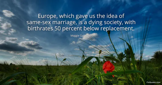 Gallagher, Maggie. (2026, January 16). Europe, which gave us the idea of same-sex marriage, is a dying society, with birthrates 50 percent below replacement. FixQuotes. https://fixquotes.com/quotes/europe-which-gave-us-the-idea-of-same-sex-102286/