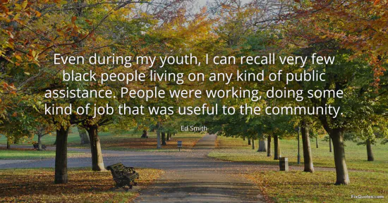 Smith, Ed. "Even during my youth, I can recall very few black people living on any kind of public assistance. People were working, doing some kind of job that was useful to the community." FixQuotes. January 17, 2026. https://fixquotes.com/quotes/even-during-my-youth-i-can-recall-very-few-black-47078/.