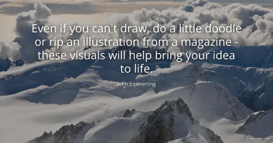 Emmerling, John. "Even if you can't draw, do a little doodle or rip an illustration from a magazine - these visuals will help bring your idea to life." FixQuotes. January 15, 2026. https://fixquotes.com/quotes/even-if-you-cant-draw-do-a-little-doodle-or-rip-157128/.
