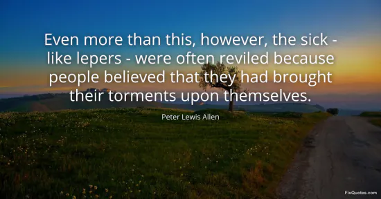 Allen, Peter Lewis. (2026, January 16). Even more than this, however, the sick - like lepers - were often reviled because people believed that they had brought their torments upon themselves. FixQuotes. https://fixquotes.com/quotes/even-more-than-this-however-the-sick-like-105611/