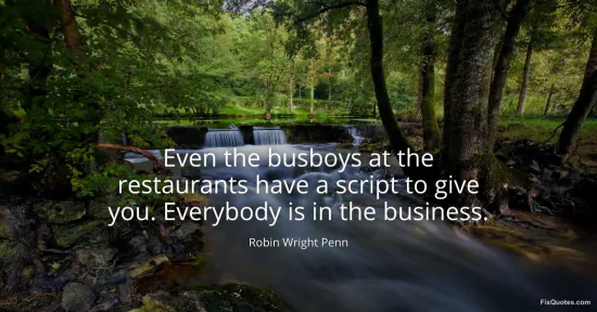 Penn, Robin Wright. "Even the busboys at the restaurants have a script to give you. Everybody is in the business." FixQuotes. January 16, 2026. https://fixquotes.com/quotes/even-the-busboys-at-the-restaurants-have-a-script-106427/.