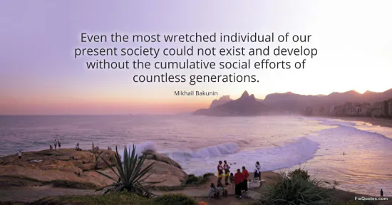 Bakunin, Mikhail. "Even the most wretched individual of our present society could not exist and develop without the cumulative social efforts of countless generations." FixQuotes. January 18, 2026. https://fixquotes.com/quotes/even-the-most-wretched-individual-of-our-present-16460/.