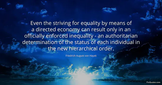 "Even the striving for equality by means of a directed economy can result only in an officially enforced inequality - an authoritarian determination of the status of each individual in the new hierarchical order." FixQuotes, 15 Jan. 2026, https://fixquotes.com/quotes/even-the-striving-for-equality-by-means-of-a-22661/. Accessed 12 Feb. 2026.