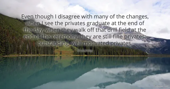 "Even though I disagree with many of the changes, when I see the privates graduate at the end of the day, when they walk off that drill field at the end of the ceremony, they are still fine privates; outstanding, well motivated privates." FixQuotes, 18 Jan. 2026, https://fixquotes.com/quotes/even-though-i-disagree-with-many-of-the-changes-6512/. Accessed 12 Feb. 2026.