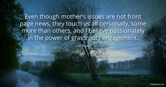 Blades, Joan. "Even though mother's issues are not front page news, they touch us all personally, some more than others, and I believe passionately in the power of grassroots engagement." FixQuotes. January 16, 2026. https://fixquotes.com/quotes/even-though-mothers-issues-are-not-front-page-110653/.
