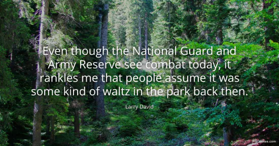 David, Larry. "Even though the National Guard and Army Reserve see combat today, it rankles me that people assume it was some kind of waltz in the park back then." FixQuotes. January 17, 2026. https://fixquotes.com/quotes/even-though-the-national-guard-and-army-reserve-32439/.