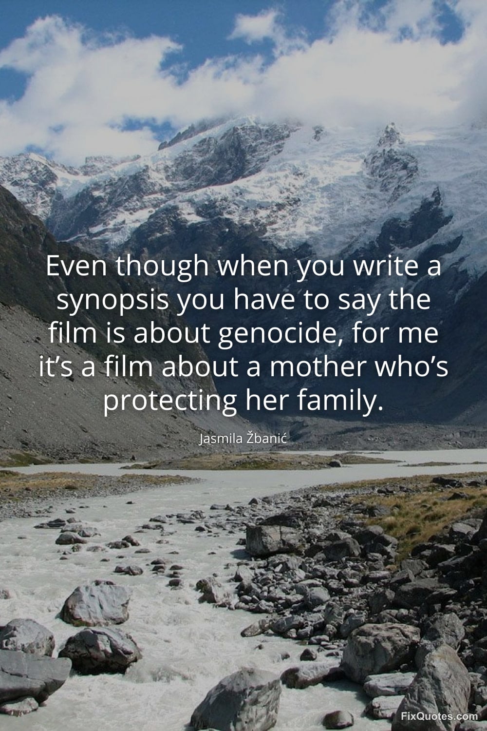 Žbanić, Jasmila. "Even though when you write a synopsis you have to say the film is about genocide, for me it's a film about a mother who's protecting her family." FixQuotes. February 16, 2026. https://fixquotes.com/quotes/even-though-when-you-write-a-synopsis-you-have-to-185396/.