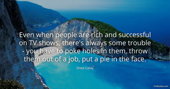 Rich, successful, perfectly lit people are boring television. Drew Carey’s line is a comedian’s blunt admission of what sitcoms quietly run on: humiliation as narrative fuel. The “trouble” he’s pointing to isn’t just conflict in the screenwriting sense; it’s the deliberate puncturing of fantasy. If characters are allowed to simply enjoy their money, romance, or status, the show stops moving. So TV has to “poke holes” in them - not because the world is cruel, but because the audience needs a pressure release, a reminder that privilege still comes with pratfalls.