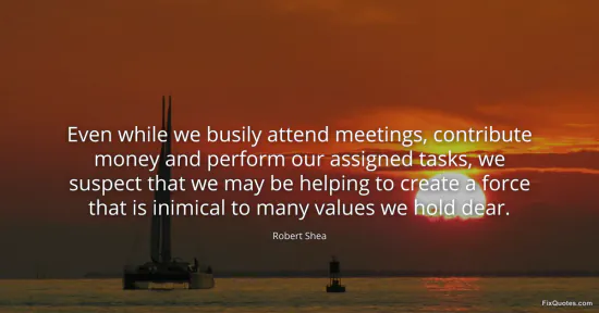 Shea, Robert. (2026, January 15). Even while we busily attend meetings, contribute money and perform our assigned tasks, we suspect that we may be helping to create a force that is inimical to many values we hold dear. FixQuotes. https://fixquotes.com/quotes/even-while-we-busily-attend-meetings-contribute-151253/