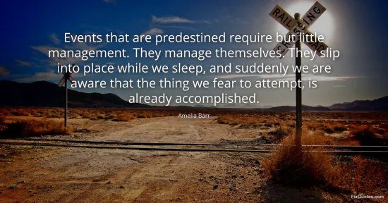 Barr, Amelia. "Events that are predestined require but little management. They manage themselves. They slip into place while we sleep, and suddenly we are aware that the thing we fear to attempt, is already accomplished." FixQuotes. January 15, 2026. https://fixquotes.com/quotes/events-that-are-predestined-require-but-little-63522/.