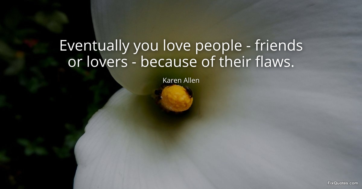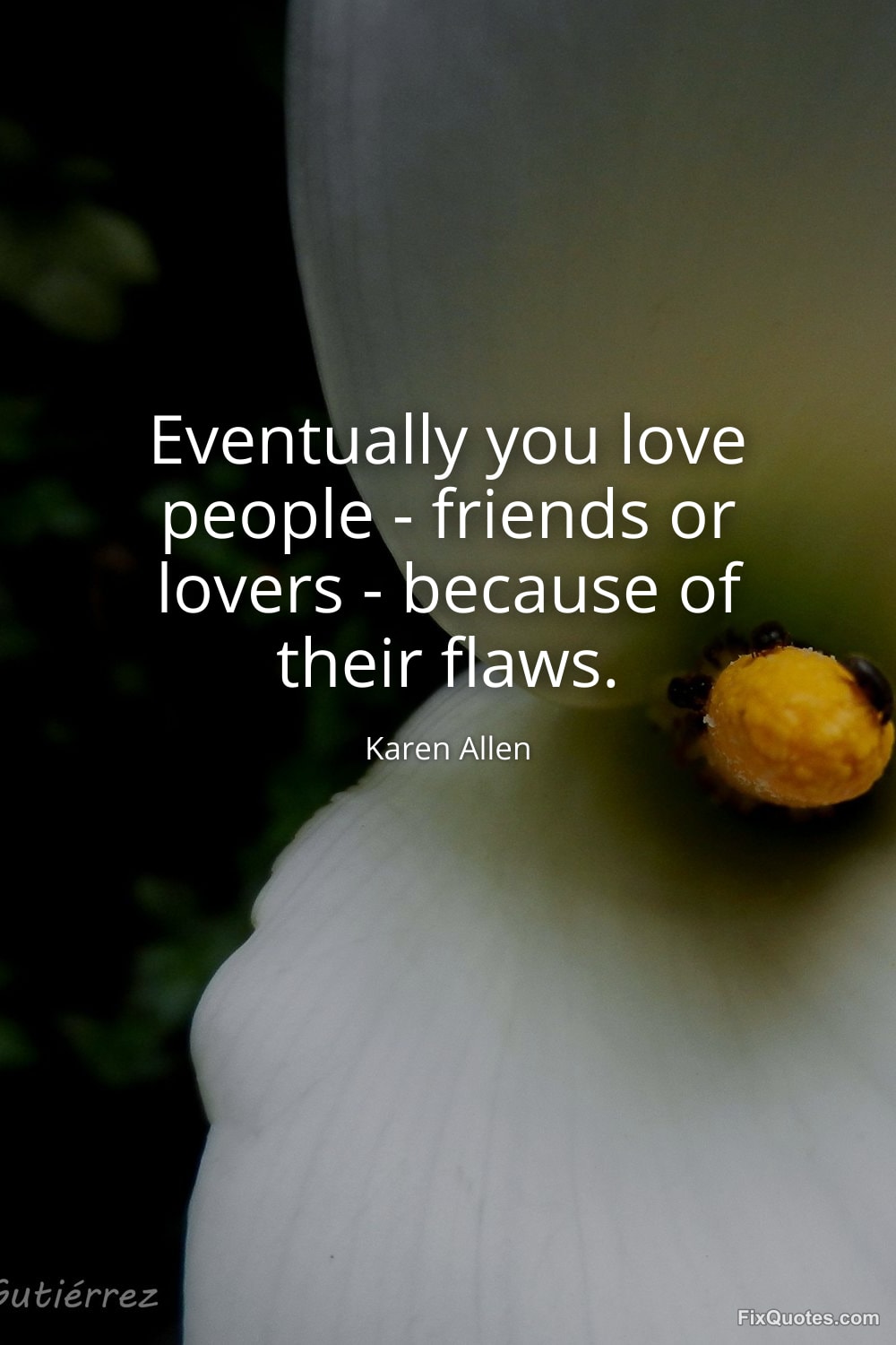 Allen, Karen. (2026, January 16). Eventually you love people - friends or lovers - because of their flaws. FixQuotes. https://fixquotes.com/quotes/eventually-you-love-people-friends-or-lovers-103403/