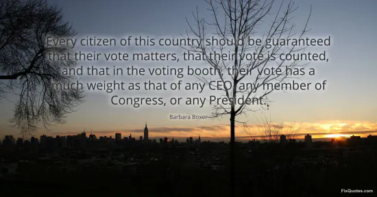 Boxer, Barbara. (2026, January 17). Every citizen of this country should be guaranteed that their vote matters, that their vote is counted, and that in the voting booth, their vote has a much weight as that of any CEO, any member of Congress, or any President. FixQuotes. https://fixquotes.com/quotes/every-citizen-of-this-country-should-be-45890/
