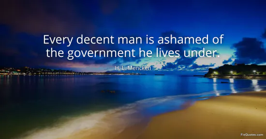 Mencken, H. L. "Every decent man is ashamed of the government he lives under." FixQuotes. February 15, 2026. https://fixquotes.com/quotes/every-decent-man-is-ashamed-of-the-government-he-36236/.