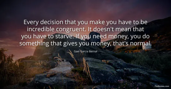 Bernal, Gael Garcia. "Every decision that you make you have to be incredible congruent. It doesn't mean that you have to starve. If you need money, you do something that gives you money, that's normal." FixQuotes. January 15, 2026. https://fixquotes.com/quotes/every-decision-that-you-make-you-have-to-be-161267/.