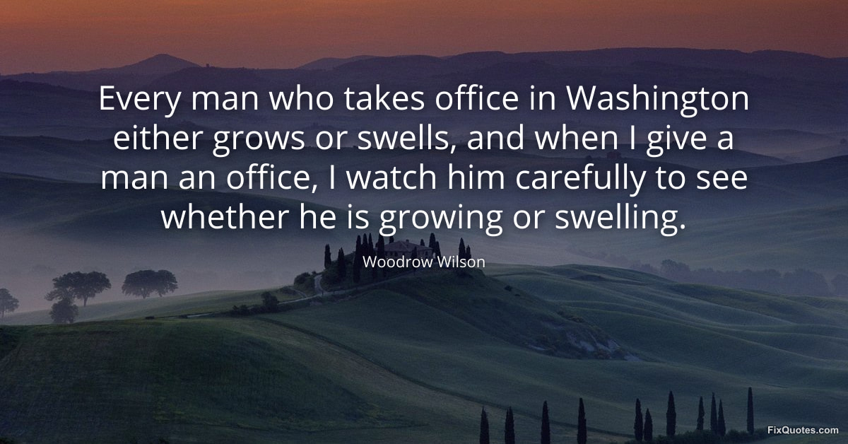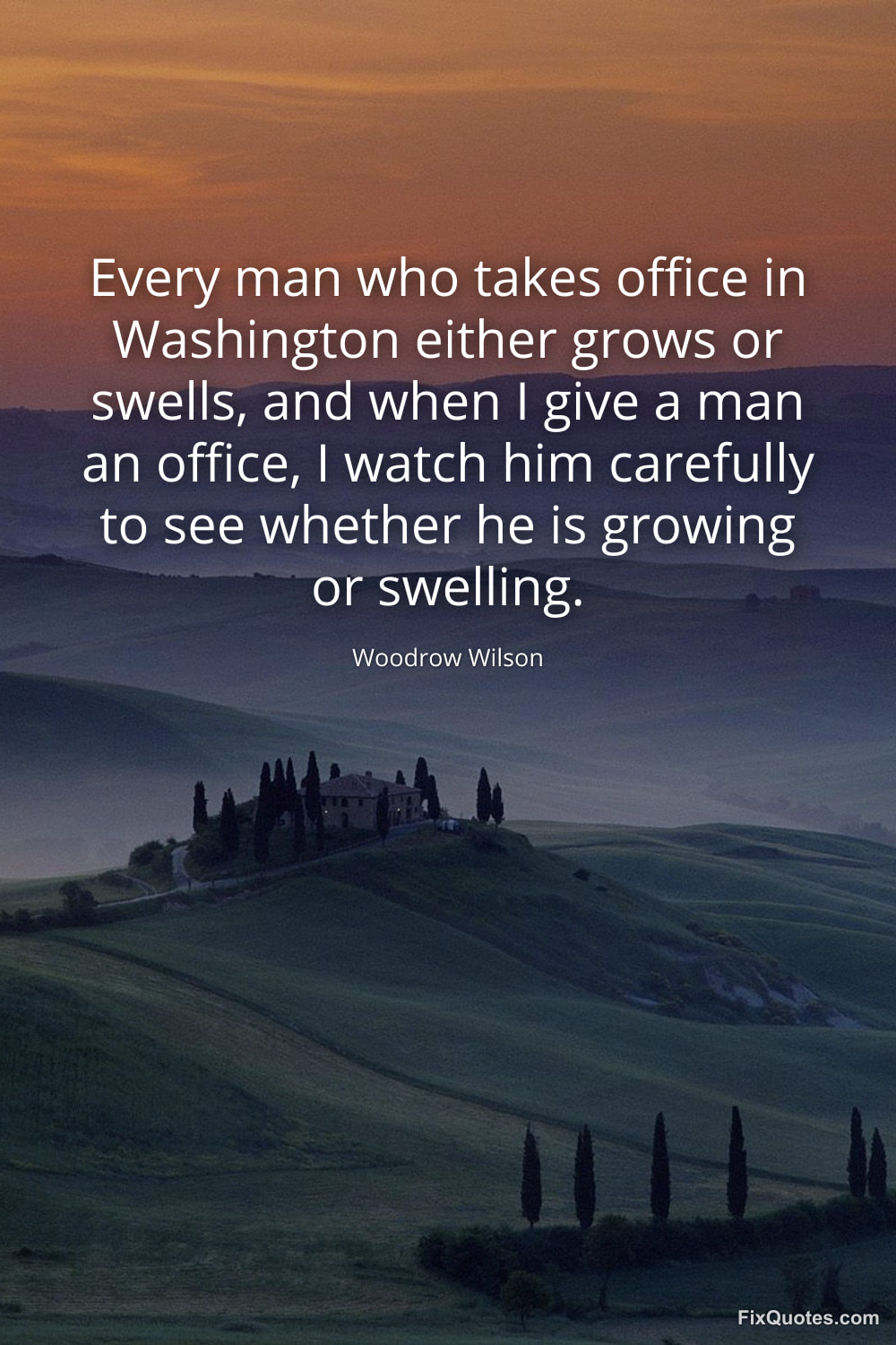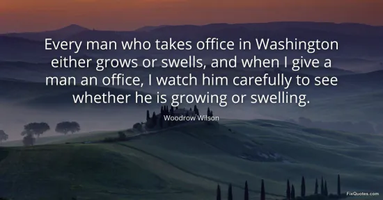 Wilson, Woodrow. (2026, January 18). Every man who takes office in Washington either grows or swells, and when I give a man an office, I watch him carefully to see whether he is growing or swelling. FixQuotes. https://fixquotes.com/quotes/every-man-who-takes-office-in-washington-either-15054/