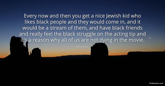 Epps, Mike. "Every now and then you get a nice Jewish kid who likes black people and they would come in, and it would be a stream of them, and have black friends and really feel the black struggle on the acting tip and it's a reason why all of us are not dying in the movie." FixQuotes. January 16, 2026. https://fixquotes.com/quotes/every-now-and-then-you-get-a-nice-jewish-kid-who-93757/.