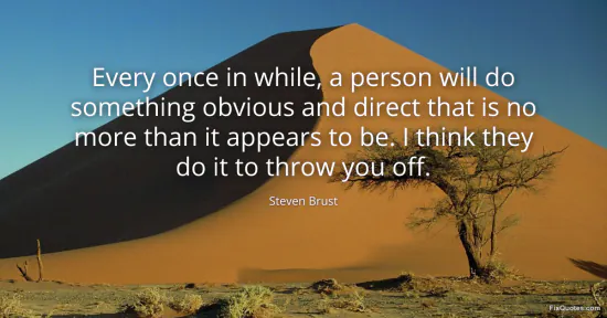 Brust, Steven. (2026, January 17). Every once in while, a person will do something obvious and direct that is no more than it appears to be. I think they do it to throw you off. FixQuotes. https://fixquotes.com/quotes/every-once-in-while-a-person-will-do-something-65879/