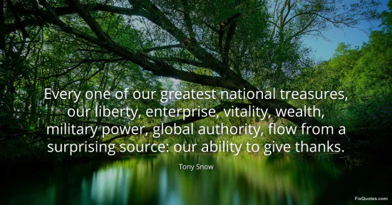 Snow, Tony. (2026, January 16). Every one of our greatest national treasures, our liberty, enterprise, vitality, wealth, military power, global authority, flow from a surprising source: our ability to give thanks. FixQuotes. https://fixquotes.com/quotes/every-one-of-our-greatest-national-treasures-our-117612/