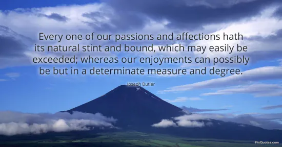 Butler, Joseph. (2026, January 18). Every one of our passions and affections hath its natural stint and bound, which may easily be exceeded; whereas our enjoyments can possibly be but in a determinate measure and degree. FixQuotes. https://fixquotes.com/quotes/every-one-of-our-passions-and-affections-hath-its-10430/