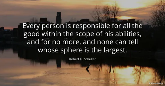 Schuller, Robert H. (2026, January 18). Every person is responsible for all the good within the scope of his abilities, and for no more, and none can tell whose sphere is the largest. FixQuotes. https://fixquotes.com/quotes/every-person-is-responsible-for-all-the-good-16389/
