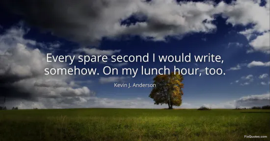 Discipline is hiding in the plainness of this line. Kevin J. Anderson doesn’t romanticize writing as lightning-bolt inspiration; he frames it as something you smuggle into the cracks of a working life. “Every spare second” lands with a faint desperation, not tragic, but practical: if you’re serious, you don’t wait for the perfect afternoon or the cleared calendar. You steal time back.
