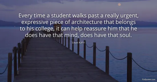 Kahn, Louis. "Every time a student walks past a really urgent, expressive piece of architecture that belongs to his college, it can help reassure him that he does have that mind, does have that soul." FixQuotes. January 14, 2026. https://fixquotes.com/quotes/every-time-a-student-walks-past-a-really-urgent-169563/.